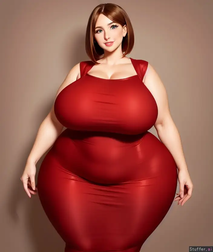 High quality, perfect anatomy, ((professionally dressed)), 30 years old, (short brown hair with side part), ((gorgeous eyes))((gorgeous hair))((gorgeous face))((extremely heavy hips)), (((hyper gigantic hips))), (((hyper gigantic thighs))), (sweet smile), feminine, modest, (((tight red dress))), highly detailed face, (love handles), (narrow waist)(((office))) ((emphasis on her hyper gigantic hips:1.2))