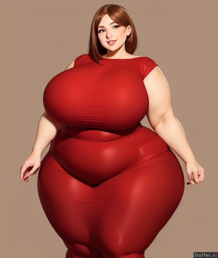 High quality, perfect anatomy, ((professionally dressed)), 30 years old, ((short light brown hair with side part)), (slightly chubby face), ((gorgeous eyes))((gorgeous hair))((gorgeous face))((extremely heavy hips)), (((hyper gigantic hips))), (((hyper gigantic thighs))), (sweet smile), feminine, modest, (((tight red dress))), highly detailed face, (love handles), (narrow waist)(((office))) ((emphasis on her hyper gigantic hips:1.2)) ((plump belly))