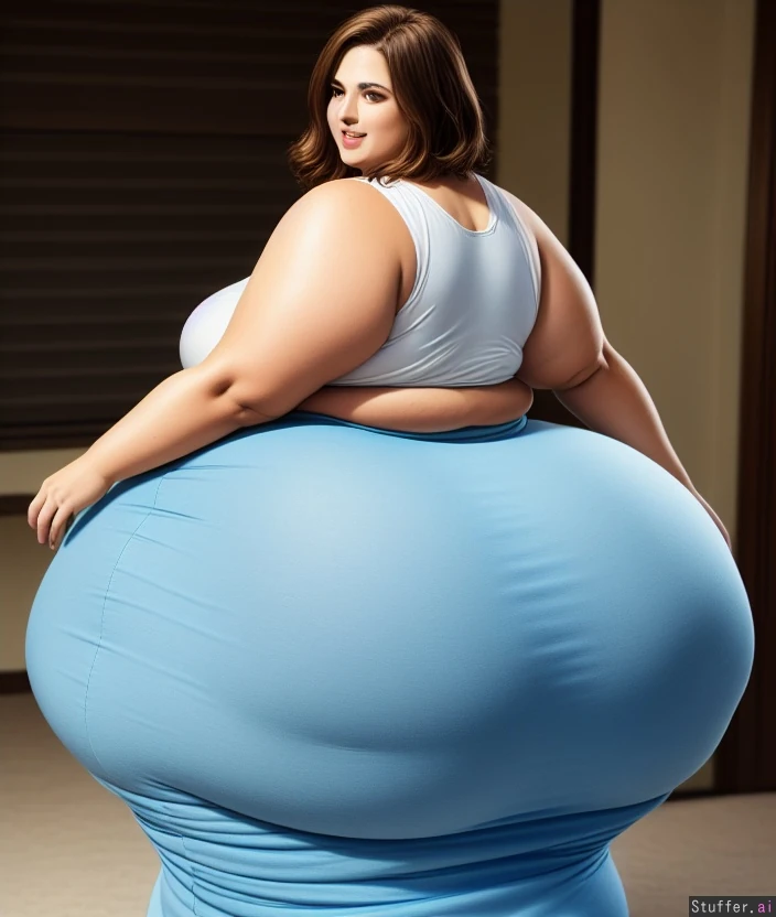 brown hair, highly detailed face, cute smile, very seductive smile, ((hyper thick thighs:1.5)), ((gigantic hips:1.5)),obese, ((hyper huge ass:1.8)), ((huge fat belly)), ((love handles:1.6)), realistic, curvy young, short hair, thin face, 8k masterpiece, ((tight blue long dress)), (standing in a bedroom), beautiful eyes, model face ((turned away, but looking behind her))((short))((fat legs))(hands on her hips)((blurred background))((butterball))((huge breasts))