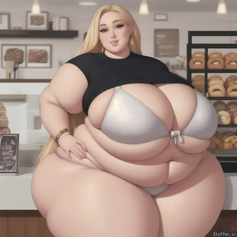 over fed blonde model, masterpiece, hyper realistic, detailed grey eyes, very detailed, ((gorgeous face))((gorgeous eyes)), sexy expression, in a donut shop, lots of donuts, sharp details, 8K, sly smile, closed lips, chubby cheeks, morbidly obese, ((SSBBW)), ((hyper gigantic hips)), ((hyper gigantic thighs)), ((hyper gigantic belly)), white bikini, ((gigantic butt)), (love handles), ((massive thighs)), ((((body weight: 5,000 lbs: 1.2))))
