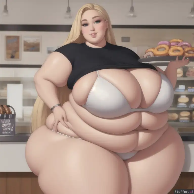 over fed blonde model, masterpiece, hyper realistic, detailed grey eyes, very detailed, ((gorgeous face))((gorgeous eyes)), sexy expression, in a donut shop, lots of donuts, sharp details, 8K, sly smile, closed lips, chubby cheeks, morbidly obese, ((SSBBW)), ((hyper gigantic hips)), ((hyper gigantic thighs)), ((hyper gigantic belly)), white bikini, ((gigantic butt)), (love handles), ((massive thighs)), ((((body weight: 5,000 lbs: 1.3))))