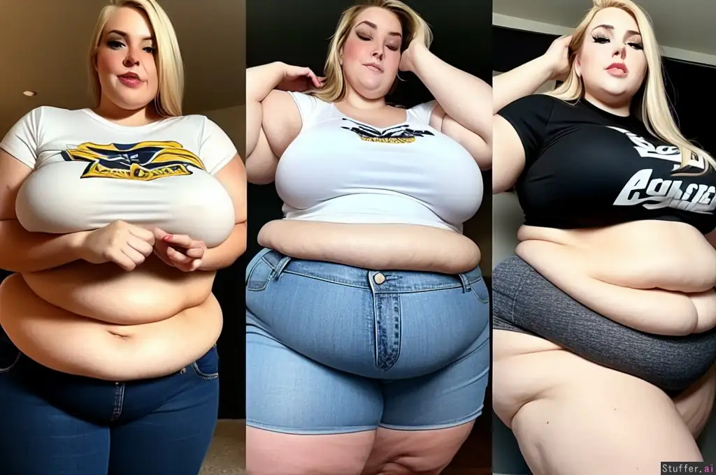 gorgeous thin blonde college girl gains weight especially in her belly and thighs, photorealistic, long eyelashes, wearing jeans and a t shirt, overeating, showing the stages of her weight gain over time going from thin to fat