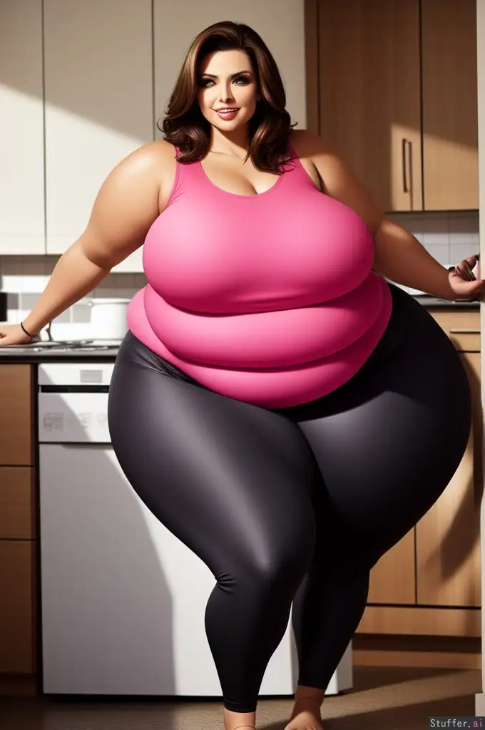 Gorgeous massively plump brunette, ((PRETTY EYES))((seductive smile))hyper plump, hyper thick, hyper bulging body, bbw, fat, (gigantic hips), (massive high waisted yoga pants), massive plain t shirt, highly realistic, highly detailed face, beautiful, standing alone in kitchen